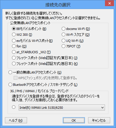 | 3G / PHS / モバイルWiMAX / モバイル ブロードバンド の接続先を登録します。 登録するには、デバイスのドライバーをあらかじめコンピューターにセットアップする必要があります。 3G / PHS / モバイル ブロードバンド を登録するには、データー端末をコンピューターに接続してください。 |