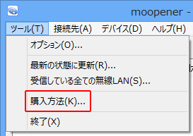 moopenerのシリアルIDの購入が完了したら、moopenerを起動してインターネットに接続(※)し、[ツール]メニューの[購入方法]をクリックしてください。