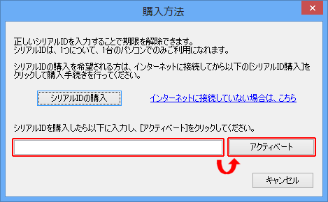 | 【3】 | 購入方法画面が表示されたら、お持ちのシリアルIDを入力して、[アクティベート]をクリックしてください。 | |||||
